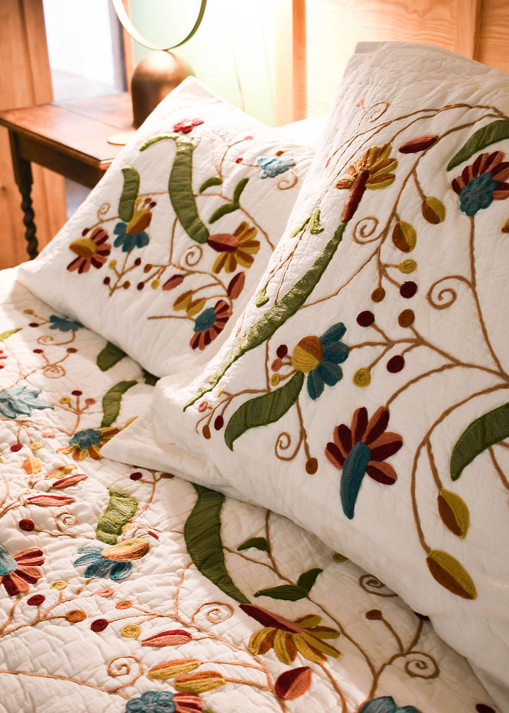 Our collections include quilts with aari embroidery, block prints and cutwork embroidery; hand-quilted throws in the kantha style; table linen with distinctive Indian prints; creatively designed cushion covers made using traditional methods; a range of rugs in cotton, wool and jute; and more!