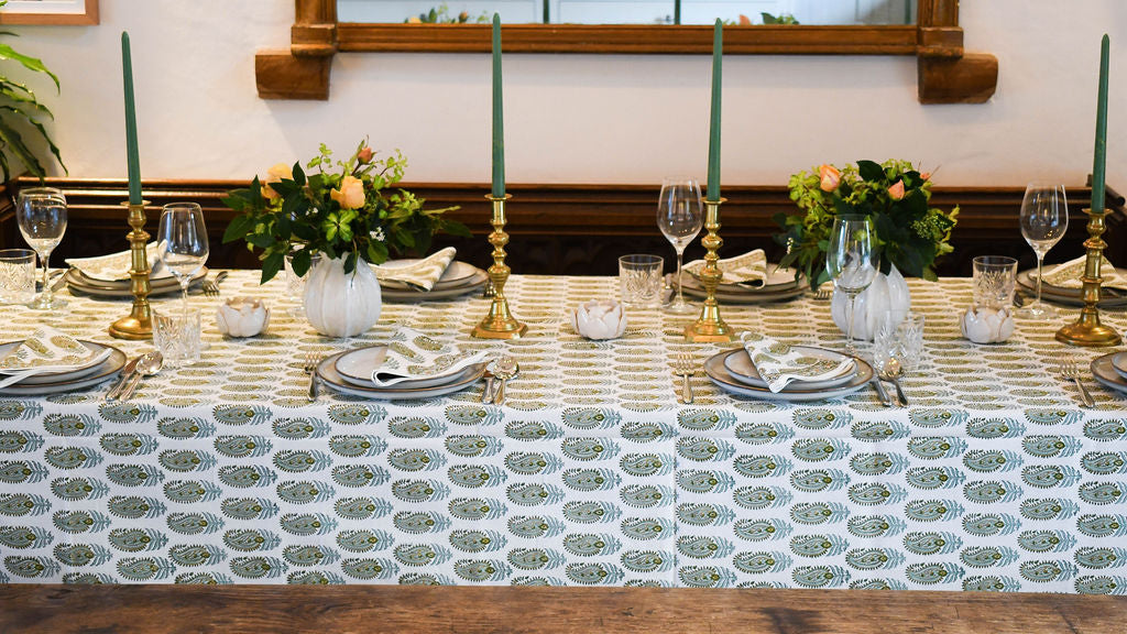 Our collection of block-printed and organdie cotton tablecloths are handcrafted in India,...